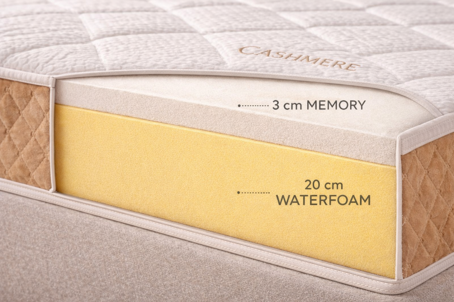 La combinazione tra Waterfoam ad alta portanza e Memory Soft assicura un perfetto equilibrio tra accoglienza e supporto, adattandosi progressivamente alla forma del corpo e favorendo una corretta postura durante il sonno.